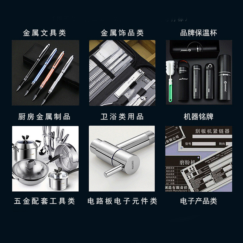適用材料包括:普通金屬及合金(鐵、銅、鋁、鎂、鋅等所有金屬),稀有金屬及合金(金、銀、鈦),金屬氧化物(各種金屬氧化物均可),特殊表面處理(磷化、鋁陽極化、電鍍表面),ABS料(電器用品外殼,日用品),油墨(透光按鍵、印刷制品),環(huán)氧樹脂(電子元件的封裝、絕緣層)。